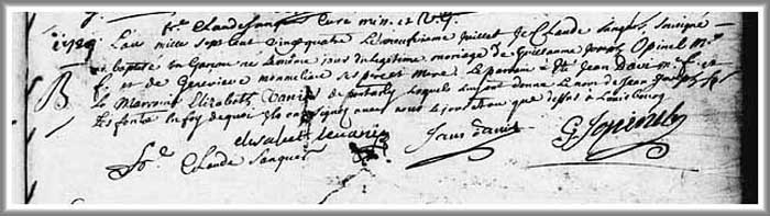 the hand of the priest, Fre Claude Sanquet, who authored the baptism record.