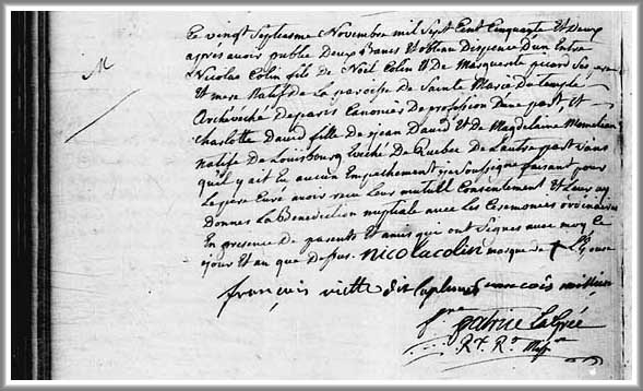 Other signatures noted on the marriage record included Nicolas Colin and Francoise Charlotte signed with an "X".