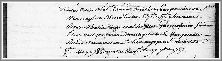 On 17 November 1757, Charlotte's 1st husband, Nicolas Colin dit Saint Lionnon, at the age of 35 years, died at the