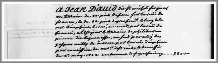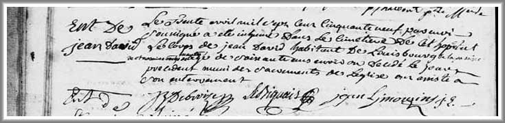 On 18 March 1758 at the age of 30 years, a Baptiste David was buried in the Cemetery of the Parish of