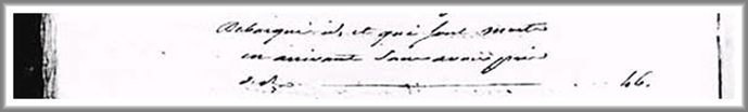 Unfortunately, after close review of the port's arrival manifest, it appears that this group of 46 passengers may have died during there deportation voyages and were "mort en arrivant", i.e., "dead on arrival" at La Rochelle. This 1759 port manifest is the second to last primary source recording uncovered to date of Jean Pierre's life. Other, abstract recordings of Charlotte and her family in a 1762 Census of Acadians in Saint-Milo or Saint-Servan, France do not reference Jean Pierre.
