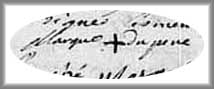 However, if you look closely at the script of this signature, in particular the letter J, and compare it to the script in the signature to the right of Jean’s, one can deduce that his brother-in-law, Guillaume Joseph Opinel, signed Jean’s signature for him. As further proof confirming that Jean Pierre was illiterate, extracts from the 3 primary source baptism records displayed below clearly list his signature as an "X" over the Ole French script "marque du pere" which translates in English to "mark of the father. The 3 "X" signatures of Jean Pierre appear in the baptism records of his children, Francois in 1727, Marie Magdeleine in 1741 and Jeanne Angelique in 1743.