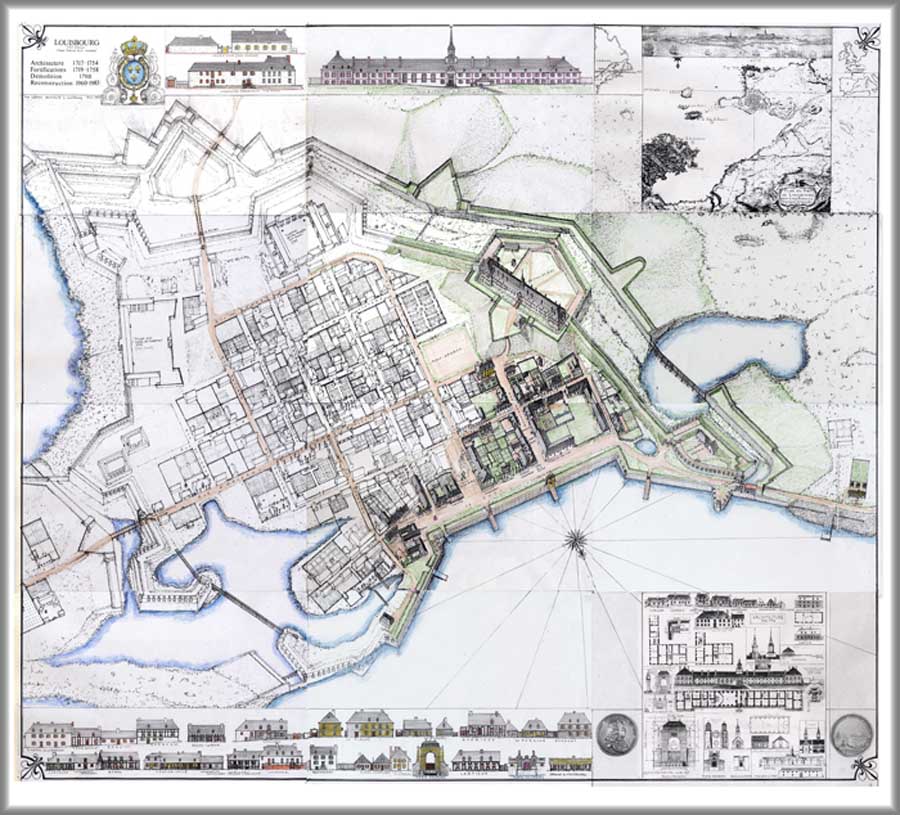 Fortress of Louisbourg, 1972-1983 drafted a 12 plate birds eye view architectural drawing known as "The History of the Architecture
