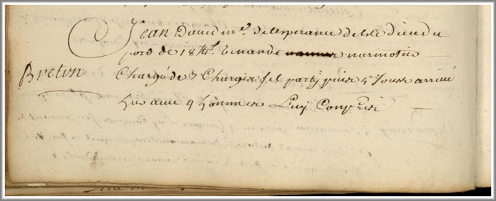 The primary source below, extracted from a La Rochelle port ships arrival manifest dated