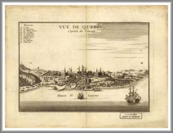As Jean Pierre grew through his infant years, an ocean away across the vast Atlantic in the city of Québec, Nouvelle France, a girl child was born on 04 April 1698 to parents, Jean Baptiste Monmellian dit Saint Germain and Marie Helaine Juneau. This baby girl whom Jean Pierre would some day share most of his adult life with was named Marie Magdelaine Monmellian. Vue De Québec 1755 by Georges Louis Le Rouge The birth of Marie Magdelaine Monmellian dit Saint Germain